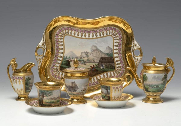 Дежене «tête-â-tête» (сервиз для завтрака вдвоем; от фр. dejeuner — завтрак; tête-â-tête — лицом к лицу) был подарен императору Николаю I и долгое время находился в Аничковом дворце. На предметах сервиза, включая поднос фигурной формы, изображены виды городов и крепостей, связанных с военными действиями во время русско-турецкой войны 1828–1829 годов на Балканах и в Закавказье. Горные вершины, мощные крепостные стены, скачущие всадники создают романтическую атмосферу победных для России сражений. Страна побед. СПб, 2025. С. 104.