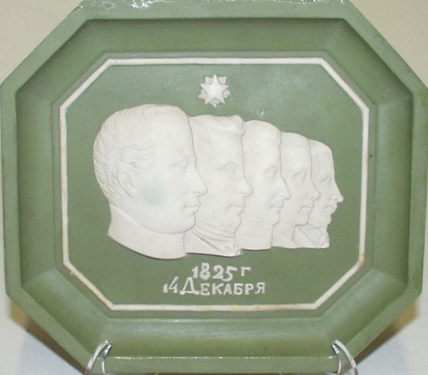 За основу композиции барельефа, выполненного одним из крупнейших советских мастеров по фарфору, Н.Я Данько взяла гравюру английского художника Уильяма Линтона (1818, Лондон - 1897, Хамден, США), ставшую самым известным изображением казненных декабристов. Линтон познакомился с А.И.Герценом в Лондоне, где русский публицист скрывался от царского правительства. Герцен много рассказывал Линтону о декабристском движении. Узнав об издании альманаха "Полярная звезда", Линтон согласился сделать для него обложку. В 1855 году он сделал групповой портрет декабристов, на котором поместил изображенные в виде барельефа профили и имена П.И.Пестеля, К.Ф.Рылеева, М.П.Бестужева-Рюмина, С.И.Муравьева-Апостола и П.Г.Каховского. Подробнее >>>