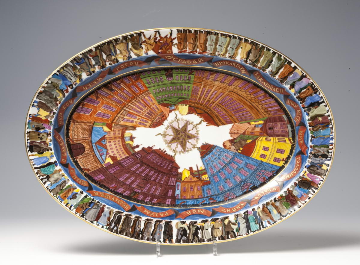 Ритмичное движение рядов демонстрантов, изображенных по борту блюда "Демонстрация", усилено помещенными на изгибе словами «Интернационала» (текст Э. Потье (1871) в переводе А.Я. Коца (1902,1937), музыка П. Дегейтера (1888), являвшегося официальным гимном Советского государства в 1918-1944 годов.