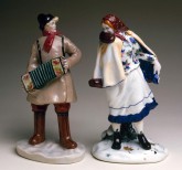 - Porcelain, painting over glaze. 20,8 x 11,1 x 9,5 («Гармонист»); 21,4 x 12,7 x 10 («Плясунья»)