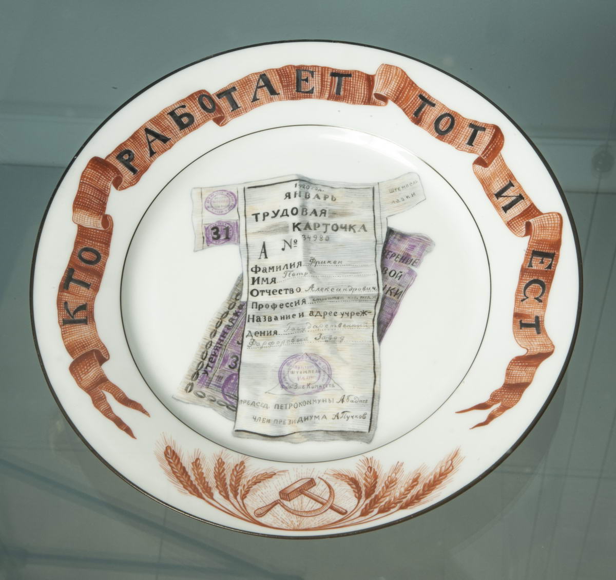 Василий Тиморев работал на Государственном Фарфоровом заводе с 1918 года, как раз когда на заводе началось производство агитационного фарфора. Блюдо Тиморева выпускалось с различными фамилиями «владельцев» трудовых карточек. На тарелке из собрания Русского музея изображена продуктовая карточка сотрудника Государственного Фарфорового завода Петра Александровича Фрикена.