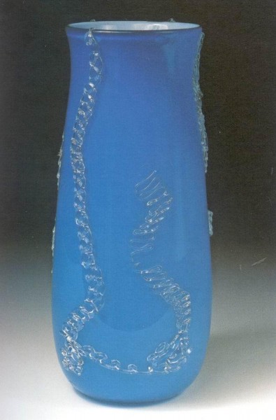 - Стекло бесцветное и цветное (голубое), молочное стекло, налепная бесцветная нить, выдувание. В. 25,3; диам. 11,3