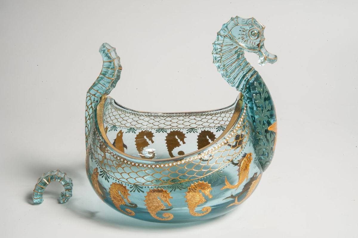 - Стекло цветное, роспись эмалями, золочение, гранение. В. 16,0; дл. 15,0; ш. 13,3