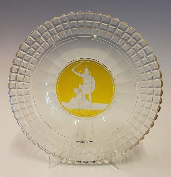 В 1838 году к 25-летию победы над Наполеоном и 10-летию заключения Адрианопольского мирного договора на Императорском стеклянном заводе по эскизам Ф. П. Толстого была исполнена серия тарелок с гравированными изображениями на темы Отечественной войны 1812 года, Заграничных походов 1813–1814 годов и русско-турецкой войны 1828–1829 годов. Серия, посвященная Отечественной войне и Заграничным походам, состояла из девятнадцати тарелок (по количеству медалей, созданных Толстым в 1814–1830), а серия, связанная с русско-турецкой войной, — из шести тарелок. Все тарелки были созданы с применением новой в то время техники серебряной протравы, благодаря которой аллегорические гравированные изображения ясно видны на желтом фоне нацвета. Тарелки были преподнесены императору Николаю I к празднику Святого Рождества в декабре 1838 года и хранились по его распоряжению в сервизной кладовой Собственного (Аничкова) дворца. Страна побед. СПб, 2025. С. 98.