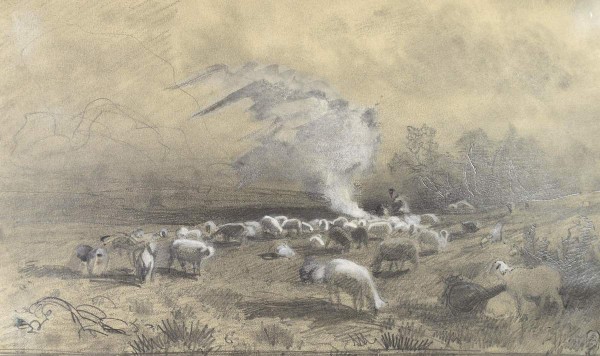 - Бумага светло-коричневая, графитный карандаш, растушка, акварель, белила. 14,2 x 23,8