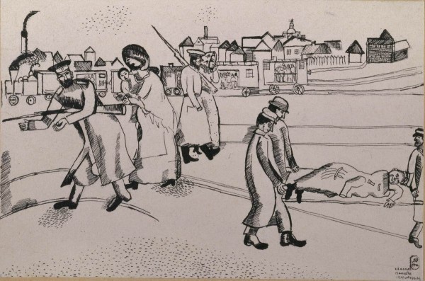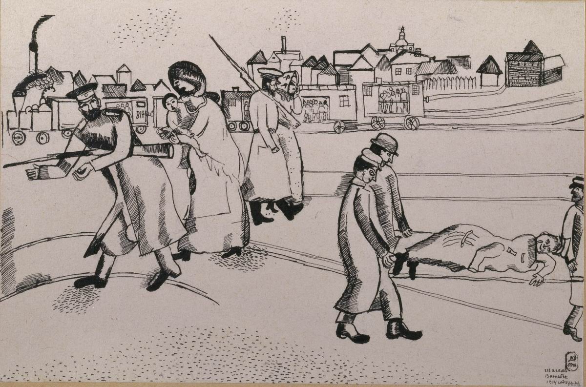 Вернувшись из Парижа в 1914 году, Марк Шагал любовно и трепетно вглядывается в облик своего мало изменившегося за годы разлуки Витебска. "Писал все, что попадалось на глаза", – вспоминает художник. В наивных, беглых, незамысловатых на первый взгляд рисунках этого времени, запечатлевающих сцены суетливой и пестрой городской жизни, чувствуются мастерство, острая наблюдательность художника, особая парижская легкость, с которой создаются листы. Фигуры спешащих прохожих, срезанные краем листа, заставляют вспомнить характерную фрагментарность композиций французских импрессионистов.