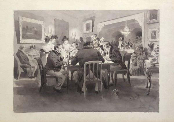 Поэму «Мертвые души» Н.В.Гоголя иллюстрировали многие известные художники. К их числу принадлежит Владимир Егорович Маковский, работавший над иллюстрациями в 1901-1902 годах. Признанный мастер «малого жанра» он создал яркие образы героев бессмертного творения выдающегося русского писателя. Акварели были опубликованы в в 1902 году в издании «Народной пользы», а также в 1948 и 1952 годах на страницах изданий Гослитиздата.