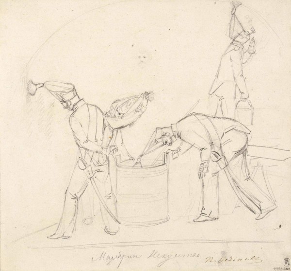 Малярное искусство (Солдаты лейб-гвардии Павловского полка помпонами киверов красят стены казармы)