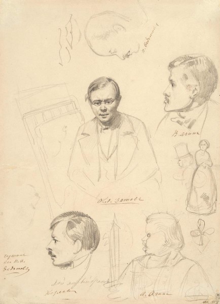 Автопортрет (в профиль) и портреты О. Л. Зотова, В. А. Агина, А. А. Козлова, А. А. Агина Женская фигура. Набросок. Другие беглые наброски
