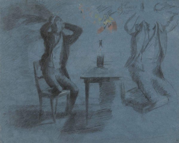 Беспокойство духа, отчаяние сквозят и в последних произведениях Федотова — «Игроки», «Анкор, еще анкор!». Рисунки к ним, как и живописные полотна, резко отличаются от всего созданного до того не только Федотовым, но и всеми художниками первой половины XIX века. Между рисунками Федотова с текстами (Р-7598, Р-7599) и эскизами к «Игрокам» (Р-7726, Р-7729, Р-7710, Р-7728, Р-7727), «Анкор, еще анкор!» (Р-7708, Р-7706, Р-7705, Р-7707) прошло всего лишь несколько лет. Между тем эти произведения будто исполнены художниками, жившими в разные эпохи, формировавшимися на разных этических и эстетических нормах. В «Игроках», как и в «Анкор, еще анкор!», Федотов уже вполне преодолел литературность, повествовательность, свойственную «натуральной школе». Он достиг графического лаконизма и выразительности, когда линия, контур не превалируют. «Работает» пятно, для которого точно найдено место в формате листа бумаги. Сочетанием сине-зеленой основы, на которой сделаны рисунки, с черным карандашом, легким прикосновением красного или желтого цветов, обозначающих тени от горящих свечей, Федотов достигает иллюзии темноты пространства, в котором происходит драматическая коллизия. Фигура человека с поднятыми к голове руками, тень от нее на полу и стене — как уход игрока в другой мир, его физическая кончина. Здесь текст не нужен. Он помешал бы сильным эмоциям, драме, постигшей проигравших. Евгения Петрова. Рисуночное наследие Павла Федотова на фоне графики 1830—1840-х годов // Павел Федотов. СПб, 2015. С. 22-23.