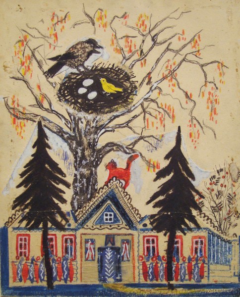 - Paper, литографский карандаш, цветной карандаш, watercolour, white pigment, ink. 21,3 х 17,2