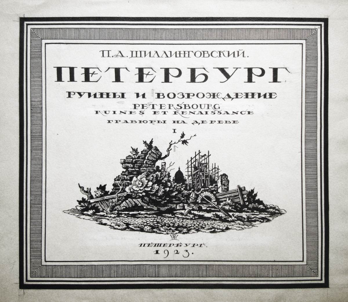 Альбом <П.А.Шиллинговского> «Петербург. Руины и возрождение» (1923) внес новую ноту в образ послереволюционного города: он уподоблен Риму, чьи античные развалины вызывают чувство эстетического благоговения и устойчивые ассоциации с архитектурными фантасмагориями прославленного итальянского гравера XVIII века Д. Б. Пиранези. Архитектура и природа — темы многочисленных серий и альбомов Шиллинговского. Он работал во многих печатных техниках и использовал особенности их изобразительного языка для создания нужного образа. Чеканным штрихом ксилографии он передавал величественность руин, архитектонику и резкость горных пейзажей. Ирина Золотинкина. Ксилография. Первая половина XX века // Ксилография из собрания Русского музея. СПб. 2019. С. 40.
