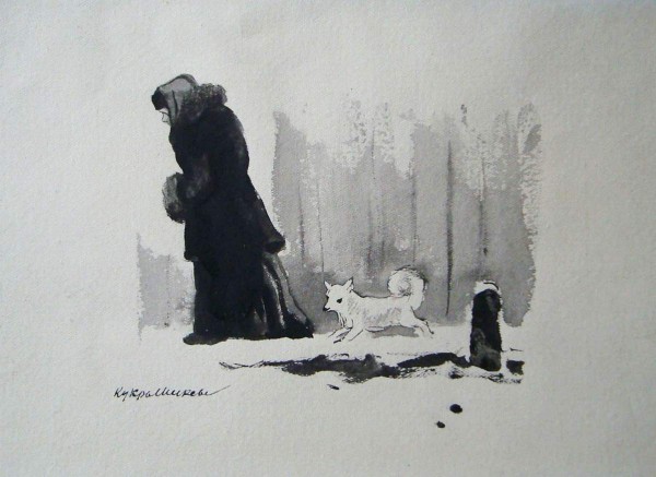 «Дама с собачкой» — этот сравнительно небольшой по объему рассказ — изданный с иллюстрациями Кукрыниксов, был насыщен рисунками, сопровождавшими каждую страницу текста. Созданные художниками образы, тесно связанные со всем содержанием и характером литературного произведения, помогали читателям проникнуть в поэтический строй чеховского рассказа и лучше и глубже понять его творчество. <...>