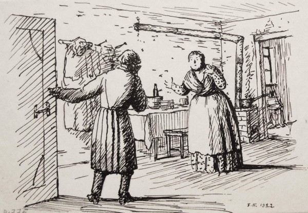 Иллюстрация к главе IX рассказа Н.С. Лескова "Штопальщик". Издательство "Аквилон", Пб., 1922, с. 28. 1922