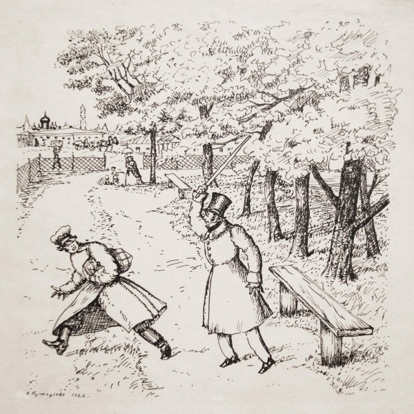 Иллюстрация к главе XIV рассказа Н.С. Лескова "Штопальщик". Издательство "Аквилон", Пб., 1922, с. 41. 1922
