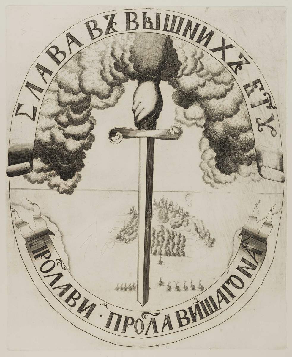 Изображена божественная десница с опущенным вниз палашом. На дальнем плане — сцена морского сражения при Гангуте, где русские галеры атакуют шведский фрегат «Элефант». Страна побед. СПб, 2025. С. 63.