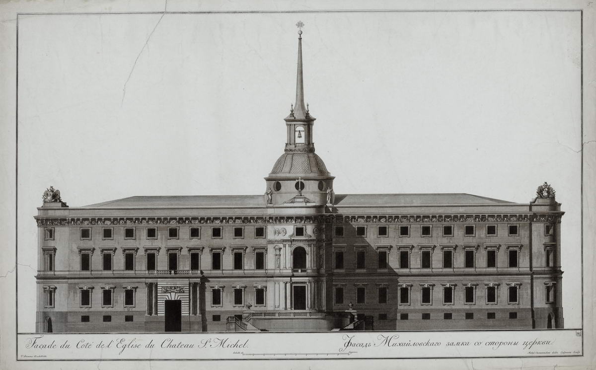 Внизу в рамке: Facade du Coté de l`Eglise du Chateau St.Michel. Фасадъ Михайловскаго замка со стороны церкви; слева внизу: V. Brenna Architecte; справа: Michel Owsiannikow delin; Calpacow sculp