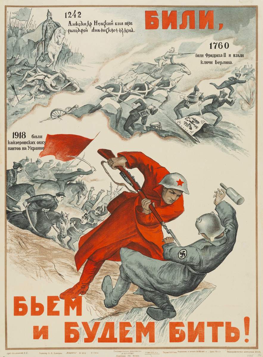 В первые месяцы Великой Отечественной войны появляются агитационные материалы, использовавшие лозунг «Били, бьем и будем бить!» Позаимствованный из песни «Не скосить нас саблей острой» (1937), он был на плакатах и в газетах, дал название мультфильму. Этот плакат напоминает о прежних победах русской армии над немецкими войсками. Страна побед. СПб, 2025. С. 152.