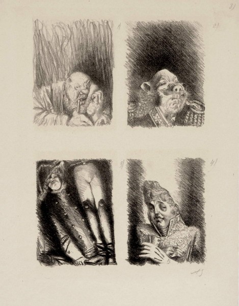 Заставки к книге М. Е. Салтыкова-Щедрина «История одного города». Глава «Опись градоначальникам» 1) Пфейфер, 2) Прыщ 3) Баклан 4) Грустилов