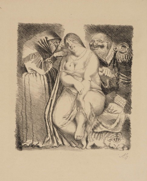 Итак, образы народа жили во мне, и нужно было лишь отобрать те, которые могли бы выразить мысль сатирика. Многие из них овеяны любовью и сочувствием, как, например, Аленка и некоторые мужики, ну, хотя бы стоящие на коленях. Иллюстрации я решил выполнить автолитографией».