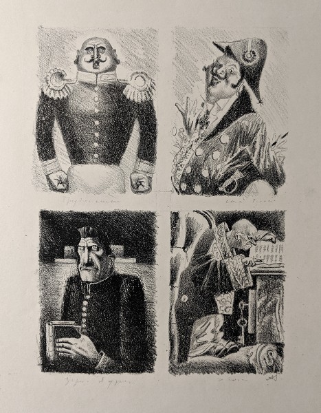 Заставки к книге М. Е. Салтыкова-Щедрина «История одного города». Глава «Опись градоначальникам».1) Брудастый Д.В. 2) Де-Санглот 3) Угрюм-Бурчеев 4) Иванов