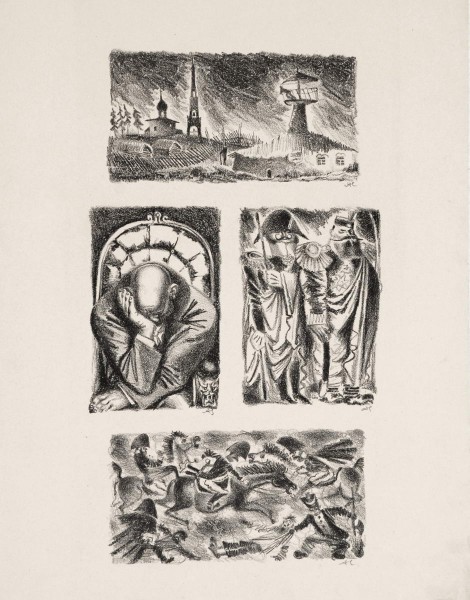 Можно сказать, что внутри комплекса иллюстраций к «Истории одного города» сосуществуют несколько стилистических линий: сюрреалиcтическая, романтическая, пародия на «кустодиевские» образы, «гоголевские типы» Петра Боклевского и Александра Агина… Неслучайно проницательные советские критики заметили, что художник «прибегает иногда к остро экспрессионистическим приемам и это уводит его в некоторых случаях от реалистического раскрытия текста Щедрина» (Доброклонский М., Лебедева Ю., Лисенков Е. Ленинградские графики // Искусство. 1935. № 3. С. 43–45).