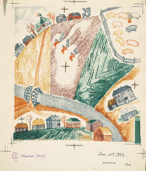 - Бумага, цветная литография. Л.: 24 х 20,8; и.: 18,4 х 17,5