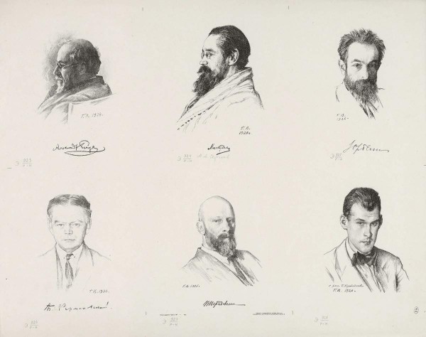 Портрет А. Н. Бенуа. 1924. Портреты М. Сергеева, И. Орбели, Б. Фармаковского, П. Нерадовского, С. Эрнста. 1926