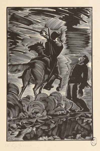 В 1933 году один из лидеров отечественной книжной графики Алексей Кравченко создал цикл иллюстраций к первой книге романа М. А. Шолохова «Тихий Дон». Это было первое иллюстрированное издание еще неоконченной, но уже ставшей знаменитой трагической эпопеи о донском казачестве (с 1928-го главы публиковались в журнале «Октябрь», состоялось и несколько отдельных изданий). Нарком просвещения А. В. Луначарский характеризовал роман Шолохова следующими словами: «Кто из классиков смог бы так описать мир, в котором клокочут страсти, <…> звериной силы, черноземных соков, потенциальной мощи там так много…» (Молодая рабочая литература. Речь на собрании комсомольских писателей и поэтов // Луначарский А. В. Искусство и молодежь. М., 1929).