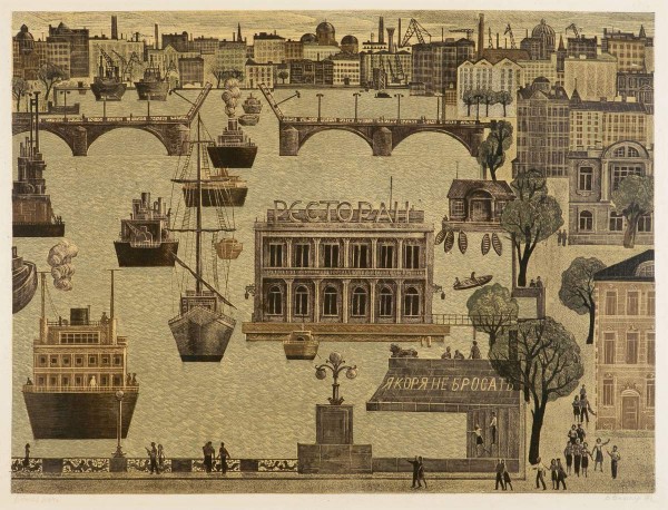 Как в любой большой работе, в серии «Дни нашей жизни» есть удачи и неудачи. Но в лучших листах сохранилось удивительно верное ощущение Ленинграда–Петербурга, в котором невозможно разделить вечное и преходящее. Вот, например, лист «Белая ночь» (1972), насыщенный всеми атрибутами, которые положено увидеть во время ночной прогулки. Разведённый мост, караван судов, проходящий по спокойной реке, плавучий ресторан, гуляющие молодые люди... Но Вильнер не просто изобразил знакомые черты предрассветного города, а как будто погрузил своё изображение в чудесный сон, в котором хочется находиться долго-долго. Н. М. Козырева. Роман с литографским камнем //Виктор Вильнер. Роман с литографским камнем. Живая графика художника, влюблённого в Петербург. М.: Центрполиграф, 2016. С. 16-17.