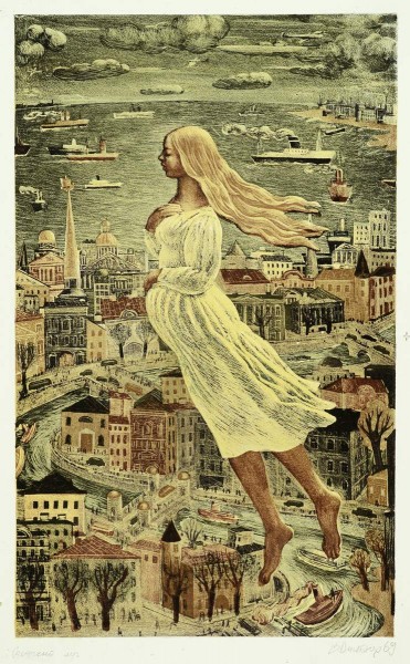 Символичен лист, названный «Солнечный луч» (1971), с изображением плывущей в небесах над мягко освещенным городам юной женщины, несущей в себе новую жизнь. Лирические грани дарования Вильнера нечасто отражались в сочинениях художника, как будто прятавшего свои чувства, часто заменявшего искренность нагромождением причудливых образов. Но в ранних литографиях эта прозрачная нежность находила возможность проявиться в сдержанности и трогательности мотива. Н. М. Козырева. Роман с литографским камнем //Виктор Вильнер. Роман с литографским камнем. Живая графика художника, влюблённого в Петербург. М.: Центрполиграф, 2016. С. 17.