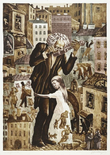 В 1974 году художник показал «Скрипача», в котором было так много печали и любви, что этот лист можно считать одним из лучших. Если фоном для шинели служил безлюдный застывший пейзаж, то в новых композициях Вильнер погружал своих героев в перенаселённый, трущобный Петербург, где обитали замученные нищетой жители. Центральная фигура скрипача неотделима от действительности, в которой пьянствуют, кончают с собой, продают всё и всех, ютятся в каморках и углах. И всё это есть в городе, изображённом художником. Но вновь контрапунктом возникает тема любви: Неточка нежно обнимает своего «батюшку», который не может оторваться от скрипки. От великой Музыки, существующей в мире вопреки Злу. Лист удивительно гармоничен, прозрачен и напоминает полуистлевший осенний листок с тонкими прожилками и угасающим цветом. В этой композиции слышны исповедальные, сокровенные интонации художника, который, вслед за писателем, надеялся на «красоту», на возвышающую силу искусства. Там же. С. 25.