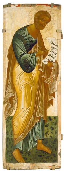 Апостол Пётр (Симон, сын Ионин, 1 до н. э. - около 67, Рим). Один из двенадцати апостолов (ближайших учеников) Иисуса Христа. Вместе с апостолом Павлом называется «первоверховным апостолом». Святой Православной и Католической церквей. В Католической церкви — первый папа римский. Изображается с ключами от рая, стражем которого является, с седыми недлинными волосами и бородой, в жёлто-синем облачении.