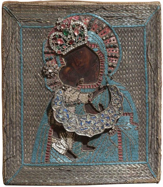 - Wood, gesso, silver, foil, glass beads, spangle, золотая нить, стекло, tempera, финифть, stitching. 26,8 х 23,8 х 2,3