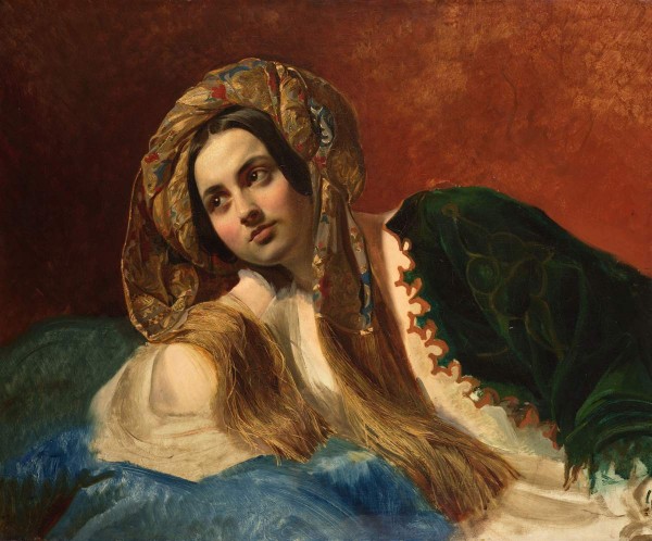 Восточная тема впервые появляется в творчестве К. П. Брюллова после путешествия с В. П. Давыдовым по Греции и Турции в 1835. Художника особенно интриговала красота восточной женщины, запретная и сокрытая от посторонних глаз. Несмотря на выразительные, индивидуализированные черты лица девушки, композиция картины является, вероятно, плодом воображением художника. Турчанок Брюллов мог наблюдать лишь во время прогулок, когда они проезжали по улице в специальной повозке в сопровождении вооруженного охранника. Согласно традиции, их лицо и голова были покрыты чадрой, а фигуру скрывала просторная фераджа до пят. Причудливое одеяние восхищало одних европейцев и совсем не нравилось другим. В. П. Давыдов так отзывался о внешности турчанок: «Женщины здешние носят странную одежду и уродливый головной убор. Но несмотря на то, я видел двух, которые всем своим дурным нарядом не могли однако ж затмить своей красоты и действия черных глаз, какие едва ли можно увидеть на нашем холодном, бледном севере» (К. П. Брюллов в письмах, документах и воспоминаниях современников / Авт.-сост. Н. Г. Машковцев. М., 1961. С. 12) . Брюллов, напротив, подчеркивает эстетическую ценность экзотического наряда. Дорогие восточные ткани словно драгоценная оправа обрамляют яркую природную красоту модели. Очарованный диковинной природой и необычными нравами, художник возвращался к образу Востока на протяжении долгих лет. Сохранилось несколько его рисунков с изображением турчанок и жанровых сцен вроде «Любовного свидания в Константинополе» (1840; ГТГ), а также живописных работ, например «Бахчисарайский фонтан» (1849; ГМИИ им. А. С. Пушкина), «Пери и Ангел» (1839–1843; ВМИИ им. И. И. Машкова). И. Г. Басова // Великий Карл. К 225-летию со дня рождения К. П. Брюллова. СПб, 2024. С. 338.