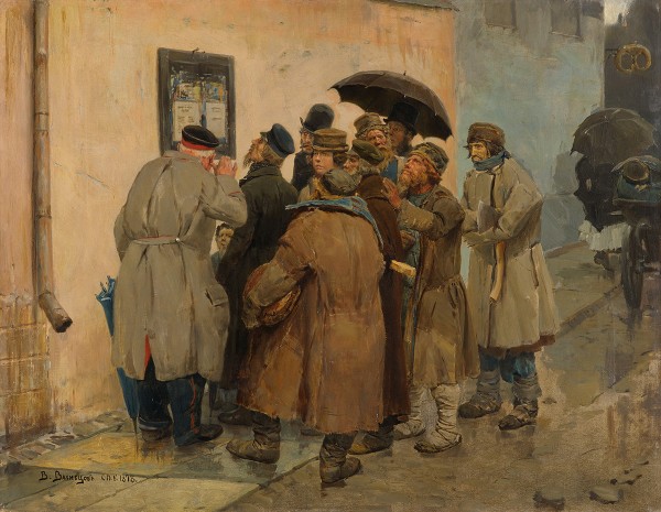 Возвращение Васнецова на родину весной 1877 года совпало с началом русско-турецкой войны. Личное восприятие этого трагического события художник отразил в картине «Военная телеграмма» (ГТГ). В центре композиции изображена группа горожан, читающих фронтовую сводку на стене дома. Приглушенная коричневато-серая гамма изображения передает атмосферу влажного воздуха и создает общее настроение картины. Произведение понравилось И. Н. Крамскому, который отмечал «жизненность» и «типичность» запечатленной уличной сцены. С. В. Кривонденченков. «В своем истинно национальном отразить вечное». Эволюция реалистической тенденции в творчестве В. М. Васнецова // Виктор Васнецов. СПб, 2024. С. 7.