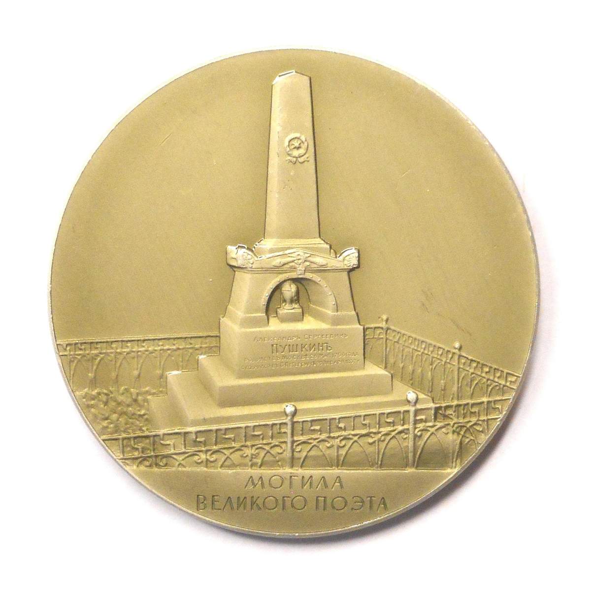 Медаль в честь А. С. Пушкина с изображением могилы поэта