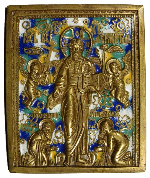 Литая иконка повторяет почитаемые московские иконописные образы Спаса Смоленского, известные с XVI столетия. В Новое время такие композиции появляются только в старообрядческом медном литье. Массовое производство подобных изделий свидетельствует об их популярности среди народа. Публикуется впервые. Татьяна Петренко // Электронный каталог «Святые земли русской». СПб. 2010. С. 74.