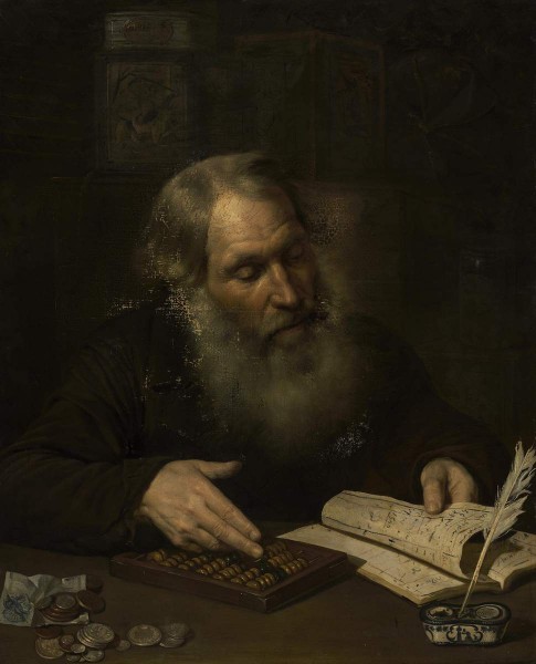 Картина поступила в ГРМ как работа неизвестного автора, но в процессе изучения удалось установить, что ее автор — уроженец Варшавы, ученик ИАХ Александр Каминский, удостоенный за картину «Купец, считающий деньги», выполненную в течение 1845–1846 учебного года, серебряной медали второго достоинства. По своему характеру картина представляет жанровую композицию с элементами натюрморта, наполненную «говорящими деталями»: короба на заднем плане, деревянные счеты, книга для записи доходов и расходов, серебряные и медные монеты 1840-х годов, смятая бумажная купюра с отчетливой датой 1840, собственно облик мужчины с бородой и в традиционном кафтане не оставляют сомнений в его социальной принадлежности. Но главное в картине, все-таки, не это, а то чувство, с которым герой производит свои нехитрые действия. Художнику мастерски удалось передать увлеченность и удовольствие, внимательную сосредоточенность персонажа своим занятием. Подобное умение живописца ярко выразить эмоциональное переживание было отмечено Советом ИАХ и в другой его картине «Бедняк слепой с мальчиком» (1846), удостоенной золотой медали «за экспрессию». Виктория Кадочникова // Для славы всероссийской! Предприниматели и меценаты в России XVIII – начала XX веков. СПб, 2024. С. 58.