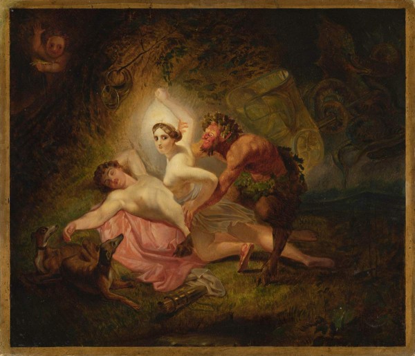 Картина написана на сюжет новеллы Джан Батисты Касти (1724–1803) «Галантные новеллы в октавах». Авторское повторение одноименной картины 1849, находящейся в ГТГ (дерево, масло. 46,5 x 58,5. Инв. 5044). Также известно еще два авторских повторения этой композиции — в собрании Пермской государственной художественной галереи (1840-е; картон, масло. 48,8 х 57,5. Ж-1597) и в частном собрании (Санкт-Петербург). Известно стихотворение А. А. Фета под заглавием «Диана, Эндимион и Сатир. Картина Брюллова» (1855). Композиция была литографирована А. А. Козловым (1851). С. Д. Алексеев // Великий Карл. К 225-летию со дня рождения К. П. Брюллова. СПб, 2024. С. 347.