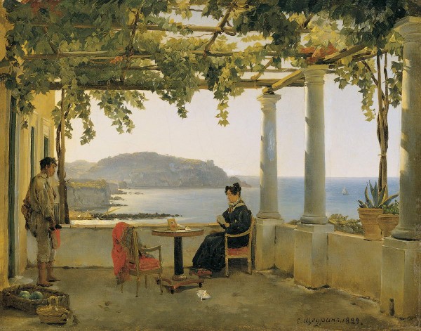 Террасы с каменными столбами, на которые положены деревянные решетки, увитые виноградными лозами, привлекали Щедрина своим местным колоритом и экзотичностью для русского зрителя. Он называл их на итальянский манер: «перголаты».
