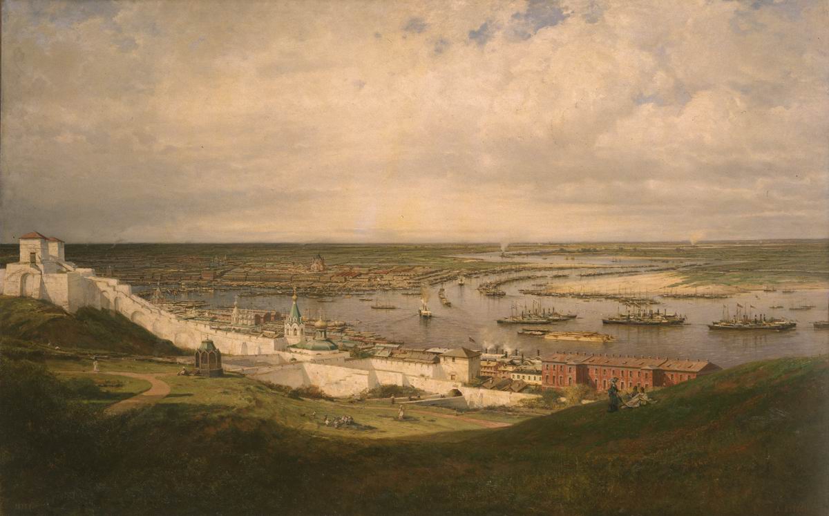 Огромная панорама Волги и Оки в месте их слияния в Нижнем Новгороде была написана Алексеем Боголюбовым с балкона губернаторского дома на высоком кремлевском берегу. Пейзаж давался художнику непросто. Он жаловался Ивану Крамскому: «Дело все не бежит вдаль, говоря о горизонте почти беспредельном, в котором теряется Волга». Пустынное пространство первого плана вовлекает зрителя в насыщенный архитектурой пейзаж: извивающаяся стена Нижегородского кремля, беленая в XIX веке, сразу за ней справа — Красные казармы, левее — Симеоновская церковь, пристань. За Волгой, слева вдали виднеется Стрелка Нижегородской ярмарки с еще строящимся Александро-Невским собором, у края холста — понтонный мост через Оку. Анна Волошко // Для славы всероссийской! Предприниматели и меценаты в России XVIII – начала XX веков. СПб, 2024. С. 80-81.