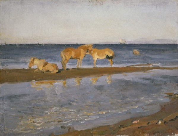 Картина написана на даче художника в Ино, близ Териок. Традиционно датируется 1905 годом (монографии И. Э. Грабаря 1914 и 1965 годов, каталоги выставок Серова 1935 и 1965; Валентин Серов). Между тем на посмертных выставках (1914) она экспонировалась (под названием „Лошади“) с датой „1900-е“, а дочь художника О. В. Серова в книге „Воспоминания о моем отце Валентине Александровиче Серове“ (Л., 1986. С. 182) отнесла ее к 1901 году. В этом есть смысл, поскольку работа „Лошади на взморье“ была показана на выставке картин журнала „Мир искусства“ 1902 года в Москве (Каталог выставки картин журнала „Мир искусства“. М., 1902. № 218 Лошади („собрание гр. Д. И. Толстого“)), а впервые, возможно, экспонировалась в Петербурге в марте того же года на 4-й выставке журнала (№ 180 Лошади). Других анималистических работ, как явствует из списка произведений в монографии Грабаря (1914) и каталогов посмертных выставок 1914 года, в собрании Толстого не было. По живописной манере и колориту она близка жанру „Финляндский дворик“ (1902, ГТГ) и могла появиться в 1901 году. Возможно, около 1905 года художником сделаны легкие правки в картине, но за давностью лет они не обнаружены при ее осмотре в отделе технологических исследований ГРМ (2004). Отправляя произведение на Международную выставку в Рим (1911), Серов называл его в письмах Толстому то: „Лошади на море“, то: „Лошади“ (Серов в переписке. Т. 2. С. 233 и 256), в то время как для самого владельца это были: „Лошади на взморье“ (Там же. С. 234). // Валентин Александрович Серов. СПб. 2005. С. 216.