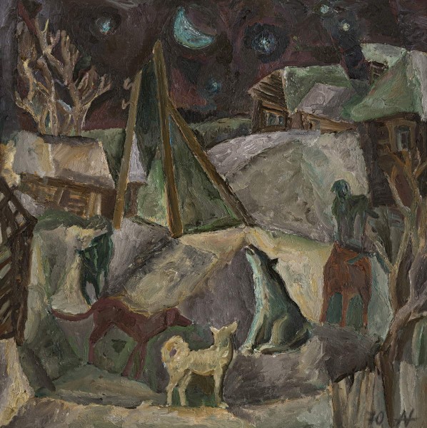 Работа «Зимняя ночь. Собаки» Николая Андронова — яркий пример уникального синтеза, где лаконичная композиция и сдержанный колорит передают не только образ зимней ночи, но и особое, почти мистическое ощущение тишины и одиночества.