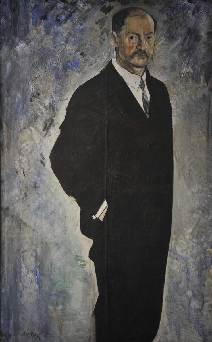 Слева внизу: Лизак; на верхней планке подрамника этикетка: „Портрет доктора Л. Е. Лизак“ 210 х 133; на правой планке подрамника карандашом: 2 м 10 х 1,33