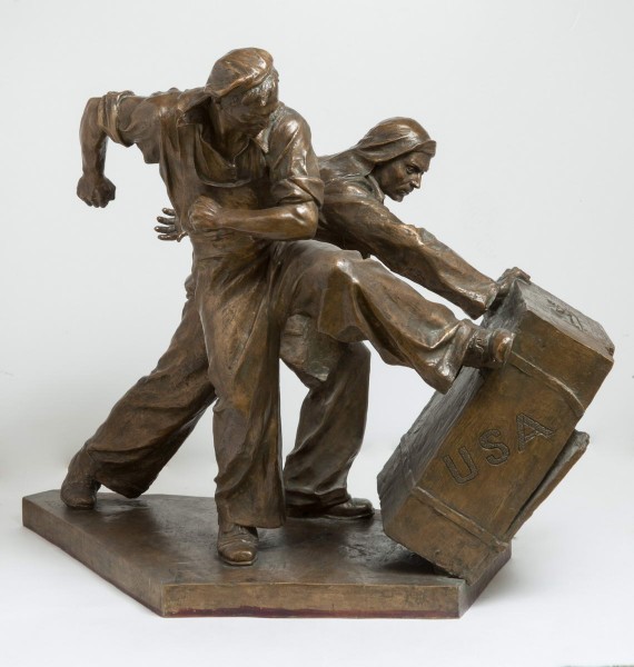 В первые послевоенные годы, когда Манизер совместно с бригадой создавал эту большую семичастную композицию «Борьба за мир», тема борьбы за мир, расколовшийся на две социальные системы, была особенно актуальна. Выполненная в присущей духу времени четкой, детально проработанной реалистической манере, эта композиция пластическими средствами подробно «рассказывает» о различных проявлениях мирной жизни и борьбы против войны. Каждая часть, снабженная развернутым литературным названием (например, «Американские снаряды — в воду» или «Он пишет слово „Мир“»), несет идеологическую нагрузку, являясь, по сути, скульптурным плакатом на антивоенную тему. Страна побед. СПб, 2025. С. 169 / Для счастья народа. Каталог выставки Русского музея в Малаге. 2018. С. 112.