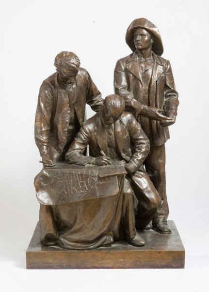 В первые послевоенные годы, когда Манизер совместно с бригадой создавал эту большую семичастную композицию «Борьба за мир», тема борьбы за мир, расколовшийся на две социальные системы, была особенно актуальна. Выполненная в присущей духу времени четкой, детально проработанной реалистической манере, эта композиция пластическими средствами подробно «рассказывает» о различных проявлениях мирной жизни и борьбы против войны. Каждая часть, снабженная развернутым литературным названием (например, «Американские снаряды — в воду» или «Он пишет слово „Мир“»), несет идеологическую нагрузку, являясь, по сути, скульптурным плакатом на антивоенную тему. Страна побед. СПб, 2025. С. 169 / Для счастья народа. Каталог выставки Русского музея в Малаге. 2018. С. 112.