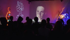 В мультимедийном зале их встретили аудио- и медиаскульптуры современного художника Виталия Виноградова: шагающий в будущее «Человек», воплощенное в металле и неоне созвездие «Кентавр» и «говорящий» «Мозг».