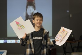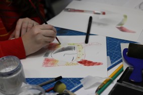 На мастер-классе ребята работали в смешанной технике. Есть коллажи и рисунки в технике трафаретной печати с дорисовкой. Мы использовали штемпельную краску, поролоновые валики и графические материалы.
