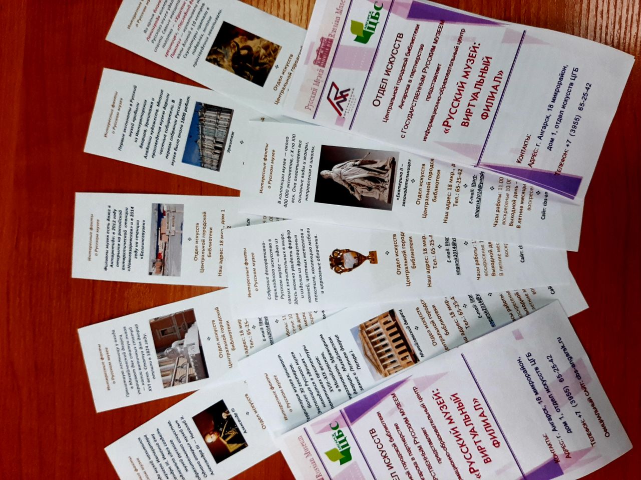 18 мая в отделе искусств ЦГБ ко Дню музеев прошла презентация проекта «Русский музей: виртуальный филиал». Посетителей отдела знакомили с медиафайлами программы. Дети и взрослые изучали историю создания музея, совершали виртуальные прогулки по его залам и играли в познавательные и развивающие игры. Всем посетителям раздавались буклеты и закладки о Русском музее и виртуальном филиале в Ангарске, которые были разработаны сотрудниками Центральной городской библиотеки.